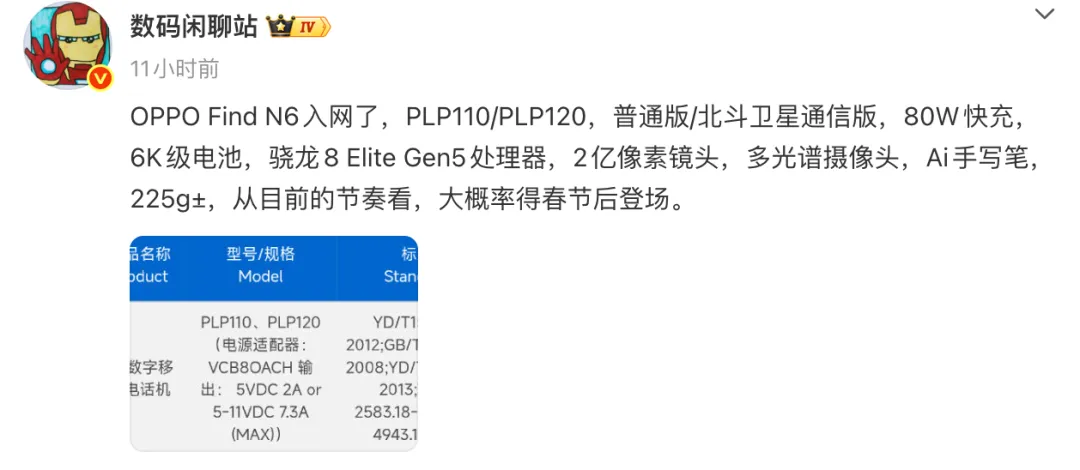 OPPO Find N6 折叠屏手机已入网,博主 @数码闲聊站 今日发文透露,OPPO Find N6 将推出普通版和北斗卫星通信版,内置 6K 级电池,支持 80W 快充,并配备 2 亿像素镜头+多光谱摄像头,拥有 Ai 手写笔配件。