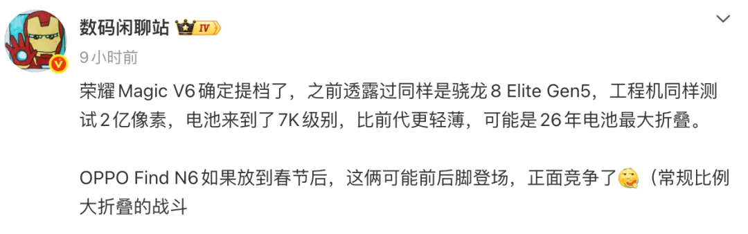 博主 @数码闲聊站 今日发文称,荣耀 Magic V6 确定提档,同样是骁龙 8 Elite Gen5 处理器,工程机同样测试 2 亿像素,电池来到了 7K 级别,比前代更轻薄,可能是 2026 年电池最大折叠屏手机。(来源:IT之家)
