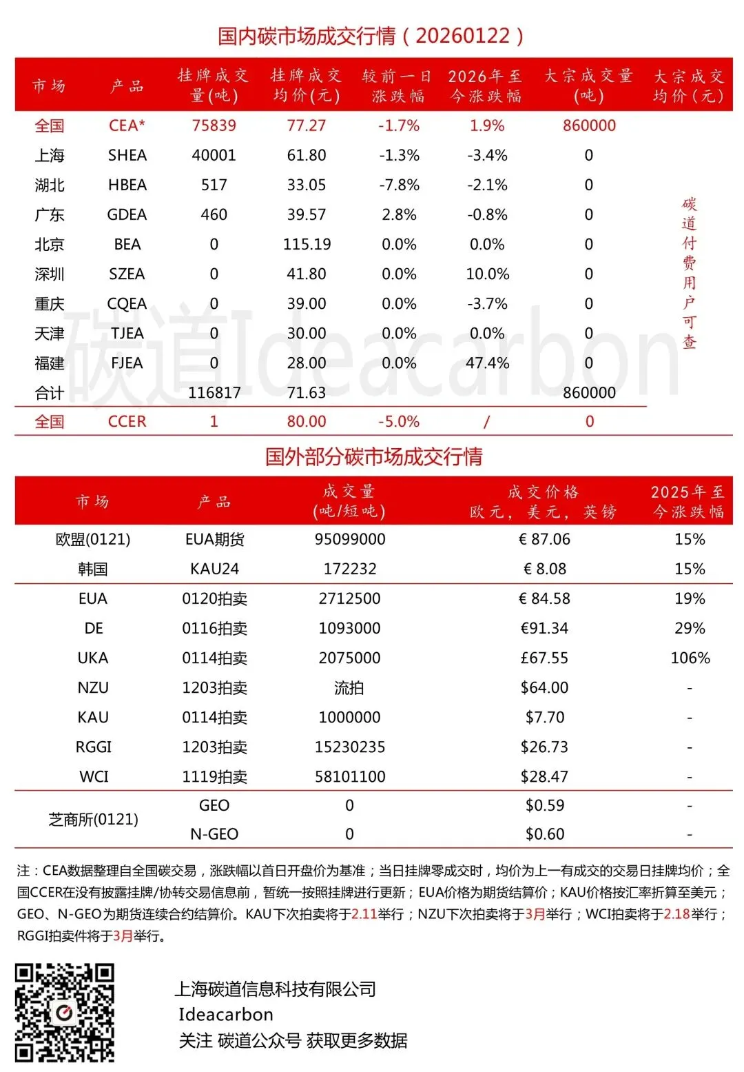 每日碳市场成交行情(20260122)