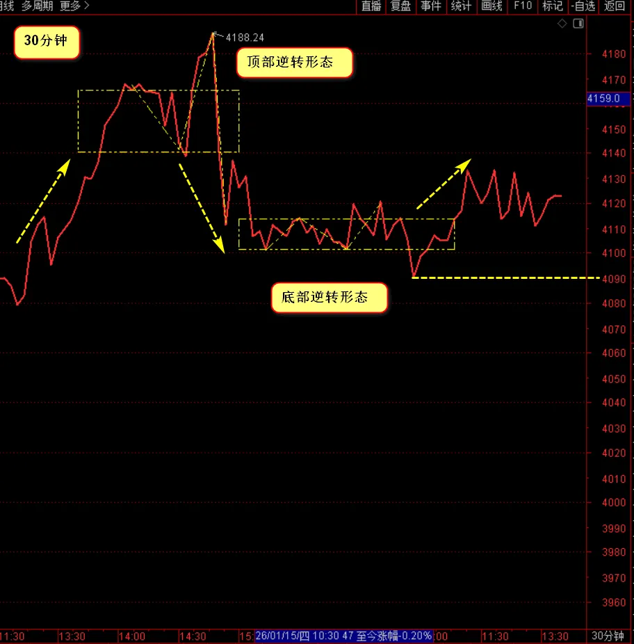 30分钟目前形成底部逆转形态,需要关注底部平台的关键点,不跌破时,可操作个股。