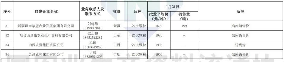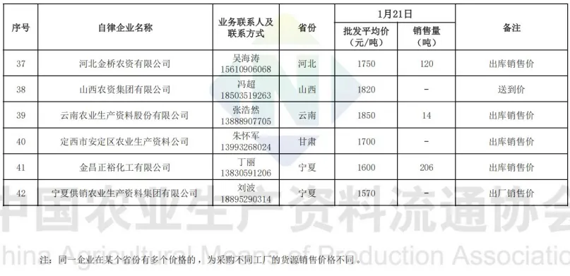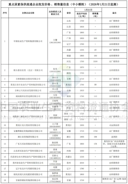 自中国农资流通协会2025年5月11日发布《关于维护化肥市场稳定、保障国内供应的倡议》以来,得到了众多农资企业的积极响应。现将2026年1月21日重点农资流通企业的尿素批发价格、销量情况向社会公布,有需要购买尿素的企业可以与这些企业联系,如发现有企业惜售、价格与发布信息不符的,可与协会联系。 邮箱:hfjubaoyouxiang@163.com。更多三农资讯,请关注中国农资流通协会微信公众号(ID:chinanzxh)本公众号旨在分享行业政策、宣传行业知识,如有侵权,请作者本人联系后台删除。