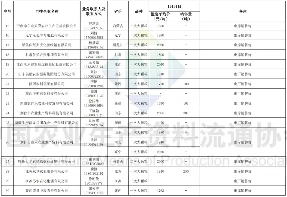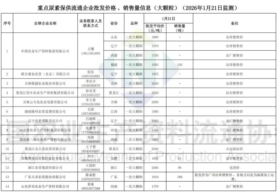 【关注】重点尿素保供流通企业批发价格、销售量信息(1月21日)