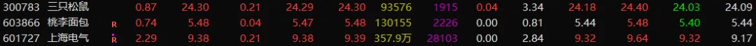 波段票:三只松鼠和桃李面包震荡,持有。上海电气收上影线冲高回落,资金在试盘,继续耐心等待。