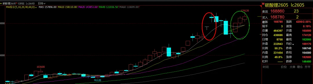 ”需求,这个消息给盘面带来的利多刺激,效果逐渐消退,最直观的就是对比碳酸锂2605合约两次从14.5万到17万之上的过程(见下图)