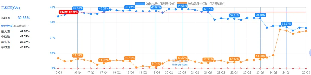 再次,我一般会看一下其毛利率如何,是否是苦逼的赚钱。假如一家公司赚点辛苦钱还要扩大再投入才能维持下去,这样的生意模式是不符合要求的。上市以来,法拉电子的毛利率中位数42.28%,最近几年有所下降,如下图(截图自理杏仁):