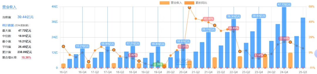 2025年,法拉电子发布三季报,去年前三季度,公司实现营业收入39.44亿元,相较于2024年三季度的34.39亿元,同比增长14.69%;2025年三季度的归母净利润为8.88亿元,相较于2024年三季度的7.75亿元,同比增长14.58%。公司主要业绩数据如下图(截图自公司三季报):