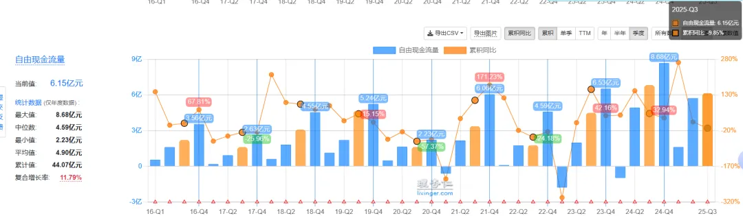 截止最新三季报期末,公司的自由现金流6亿多,这是除去资本开支,公司隐藏的金矿,如下图(截图自理杏仁):