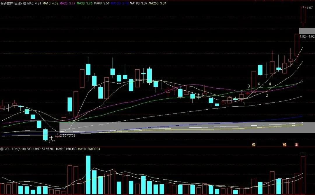 然后5日均线与10均线和20日均线加30日均线共振形成双价托,有2个三角形价托支撑股价向上,启动主升浪行情。