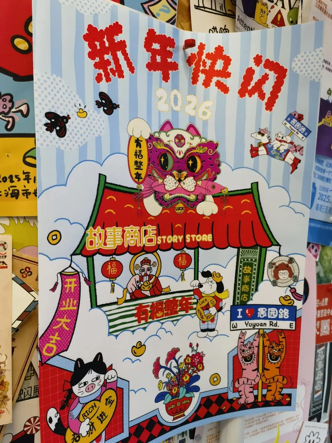 看到上海愚园路的故事商店,贴的都是很好玩的海报,是传统年画与现代潮流插画相融合的风格。