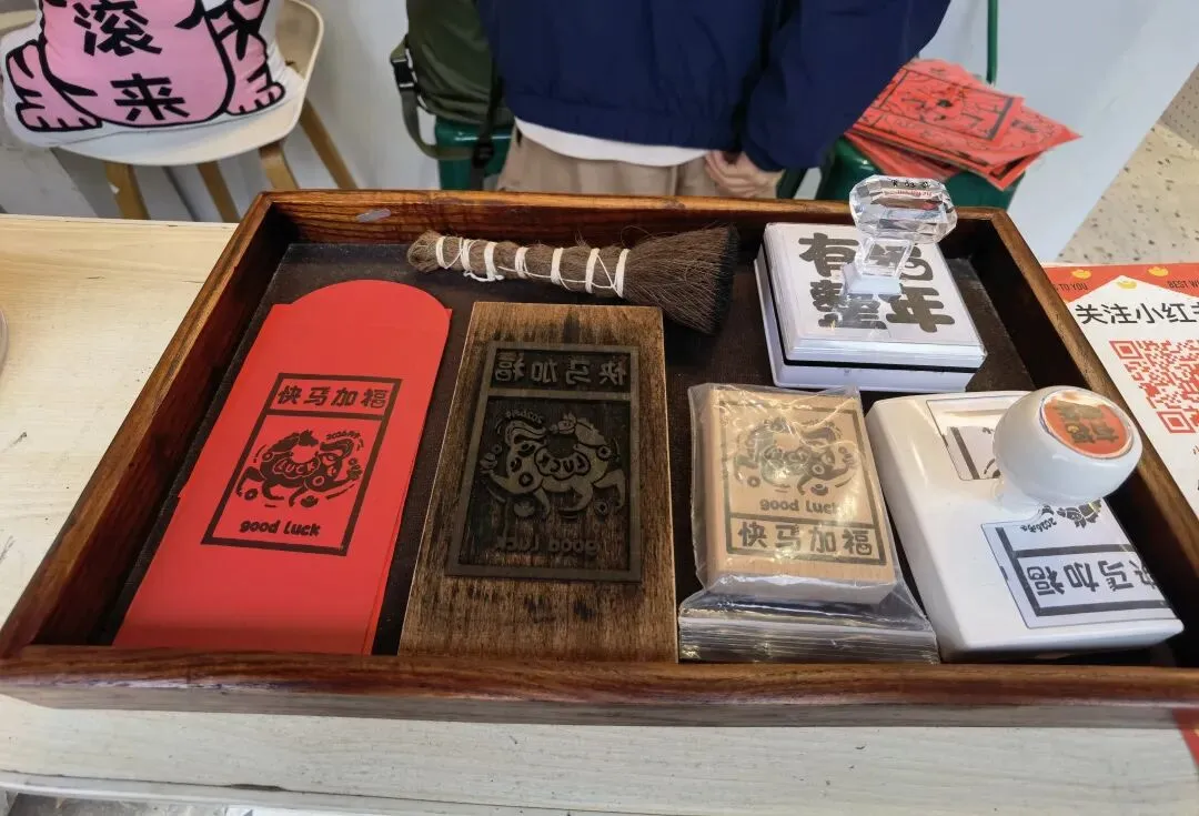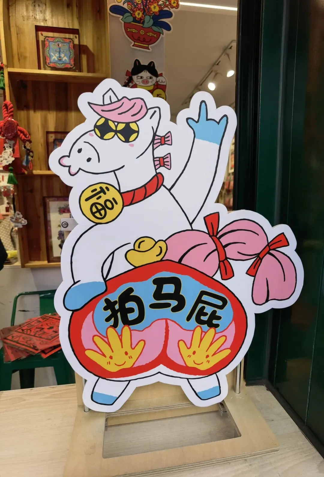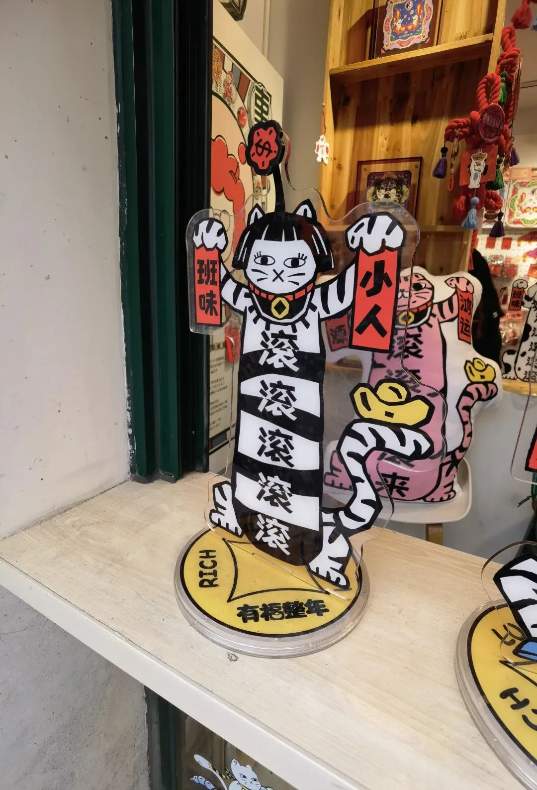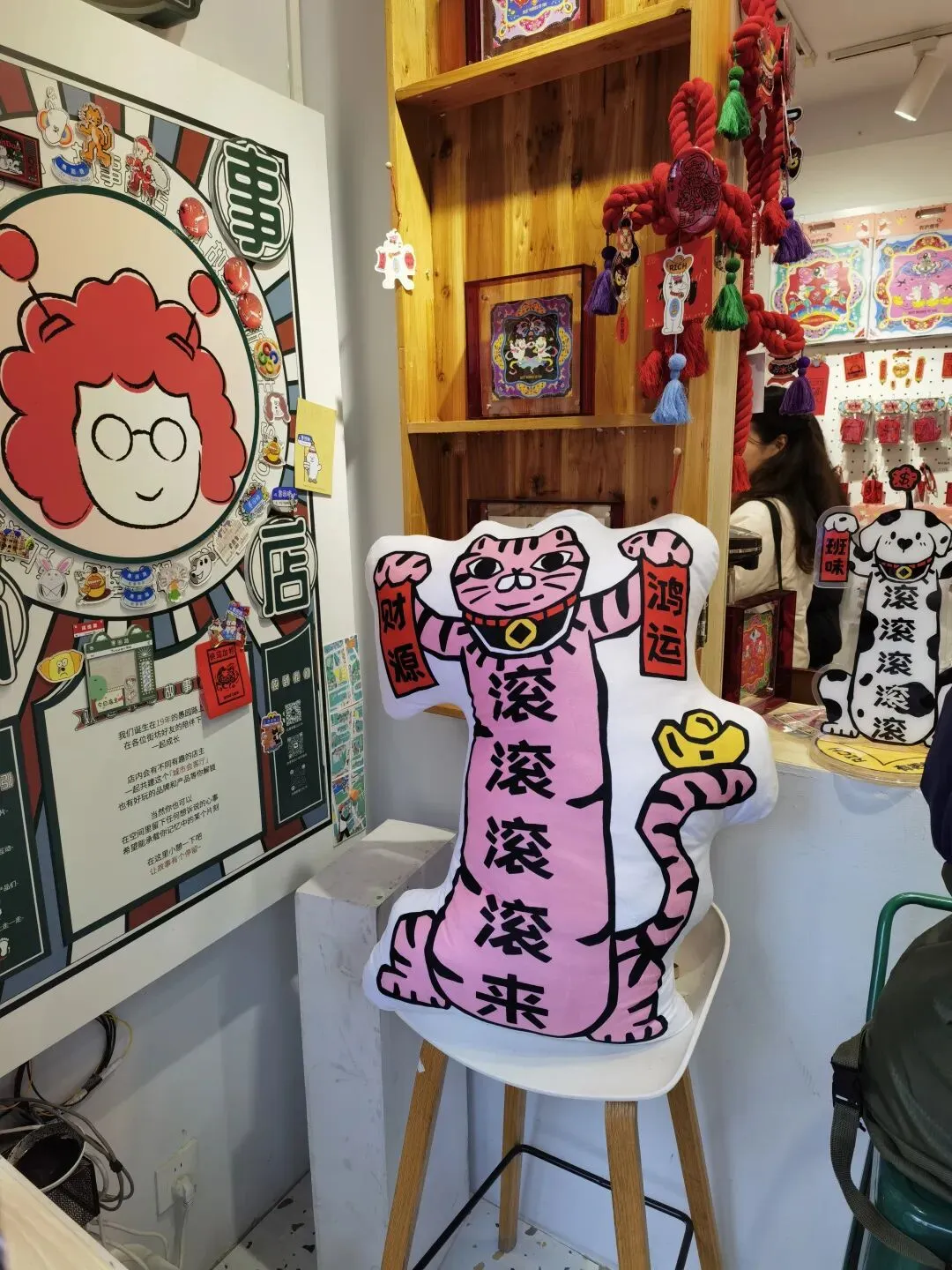 这匹马丑萌丑萌的,满眼都是钱钱儿,哈哈哈,我忍不住想拍拍。 插画师确实很有才华又有童心童趣,这些卡通形象都很可爱。 还有英文版的,神秘的东方阴阳球,红黄蓝绿的鲜艳配色,估计外国人会喜欢。 这个财运鸿运滚滚滚滚来的大抱枕,看到就想笑起来,哈哈哈。 这个小人班味滚滚滚滚滚的立牌很有意思,表达“踢走职场倦怠、赶走小人,让好运滚滚而来”的新年祈愿。