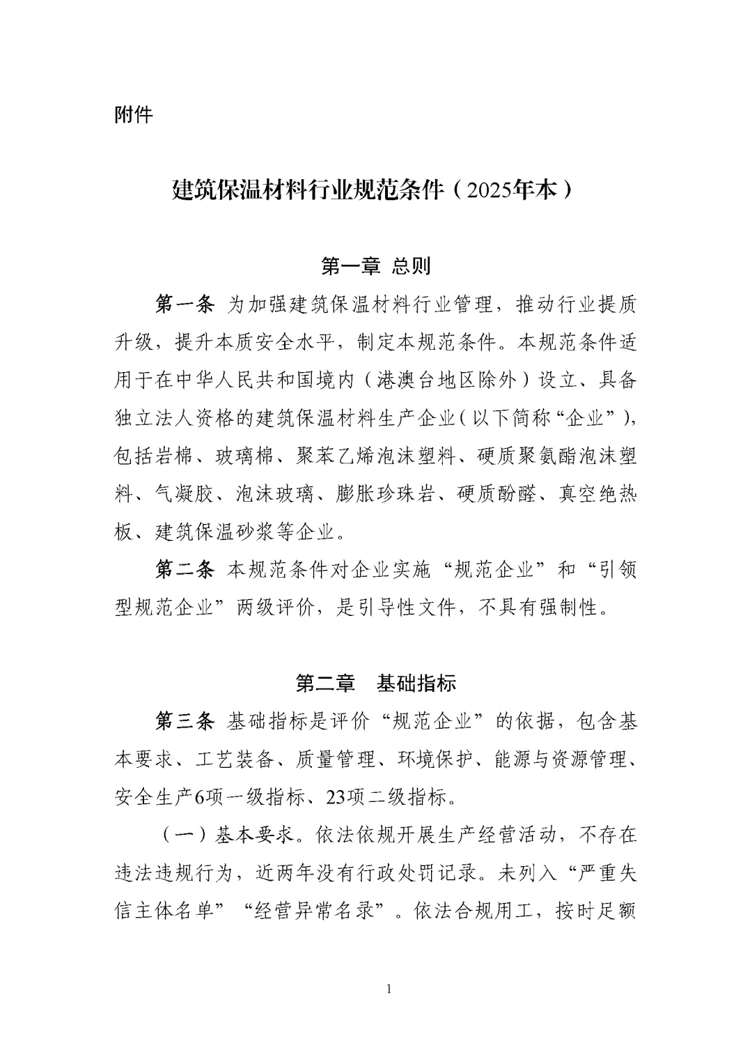 为加强建筑保温材料行业管理,推动行业提质升级,提升本质安全水平,工业和信息化部、住房城乡建设部、应急管理部、市场监管总局、国家消防救援局制定了《建筑保温材料行业规范条件(2025年本)》。现予以公告。
