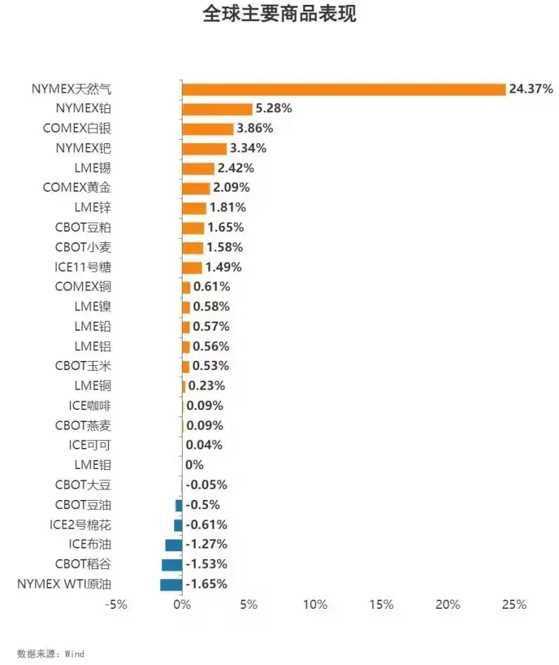 全球主要商品价格涨跌互现;国际油价表现疲软,ICE布油跌1.27%,NYMEX WTI原油跌1.65%;国际贵金属期货集体上涨,COMEX黄金涨2.09%,COMEX白银涨3.86%;伦敦基本金属多数收涨,LME锡涨2.42%,LME锌涨1.81%,LME镍涨0.58%,LME铅涨0.57%,LME铜涨0.23%。