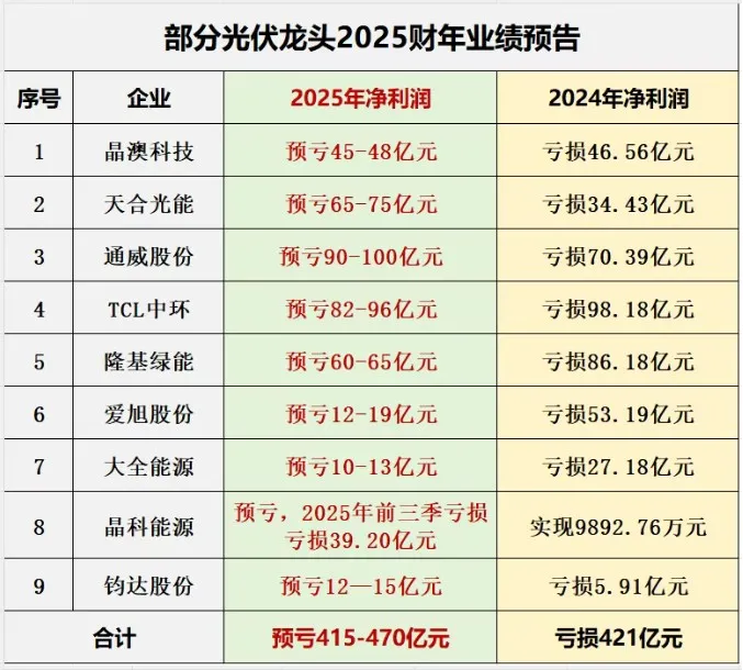 根据最新披露的业绩预告测算,仅统计内的9家光伏龙头,2025财年合计预亏已达 415–470亿元。