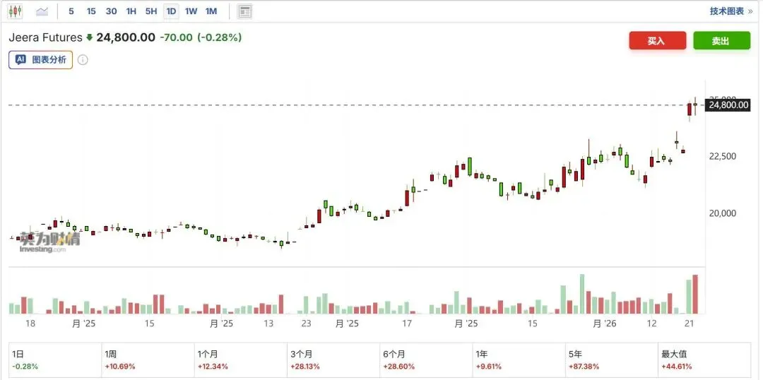 1月22日,印度孜然期货3月合约价格下跌,收盘价格为24800卢比每百公斤(折合人民币报价:19.84元/公斤,未扣除相关成本),下跌70,跌幅0.28%,3月合约价格年累计下跌1.02%。