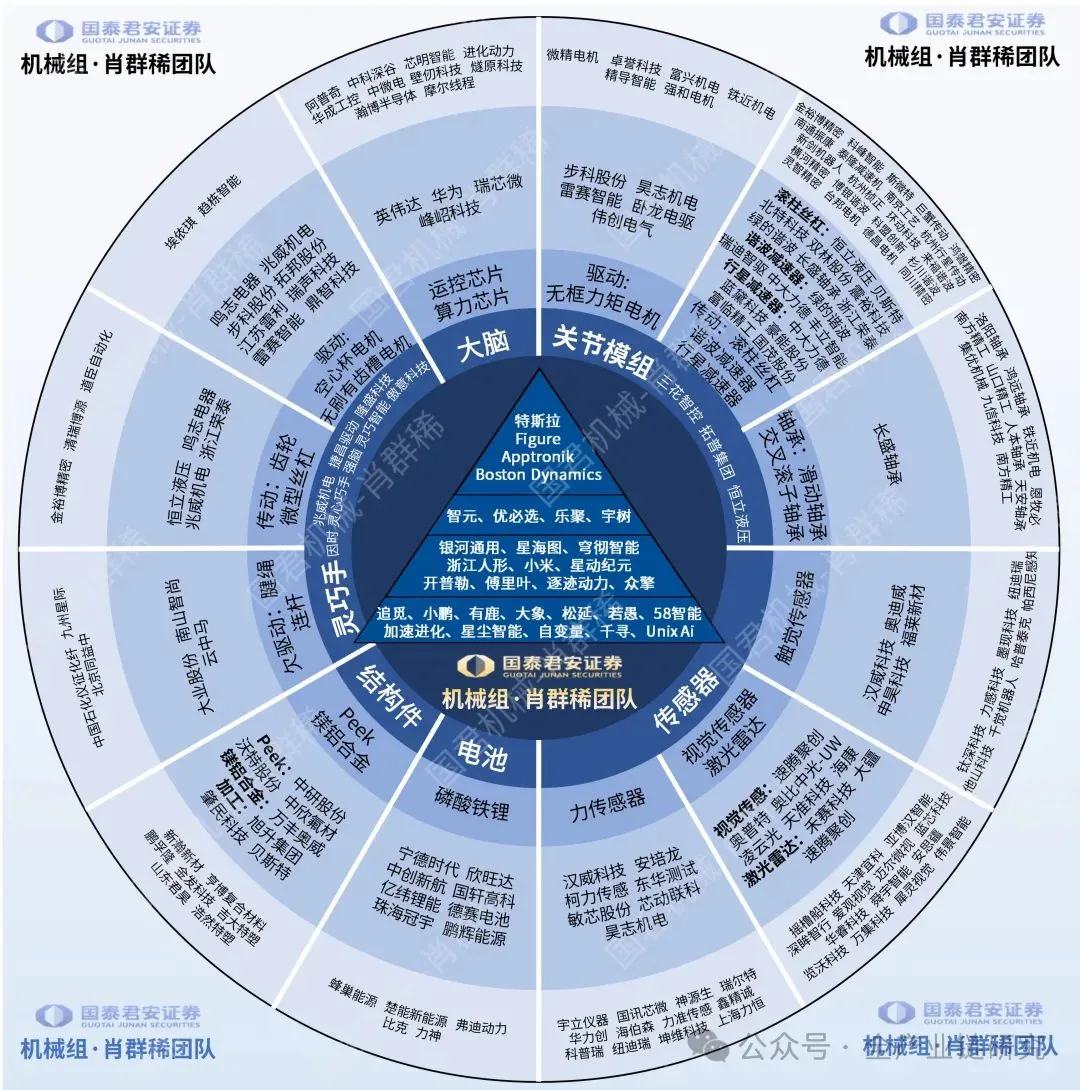 具体标的方面,特斯拉供应链标的建议重点关注浙江荣泰、恒立液压、斯菱、拓普、恒勃、力星等。其中,浙江荣泰本轮定点拿到小四杠、小模组及身上的几个大四杠,后续会有身上大模组跟减速器持续放量;恒立液压身上大四缸净气很高,小四缸身上的大电机、大模组后续有增量;斯菱有可能成为国产第一家谐波供应商;拓普除算法模组外,手上产品持续对接;恒勃PEEK已确定有产品能供,后续型号可能增加。此外,国产链建议关注核心供应链标的,如宇树的美湖、品茗,乐聚的东方精工,智元的宁波华翔,云深处的卧龙电驱等