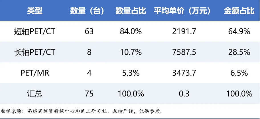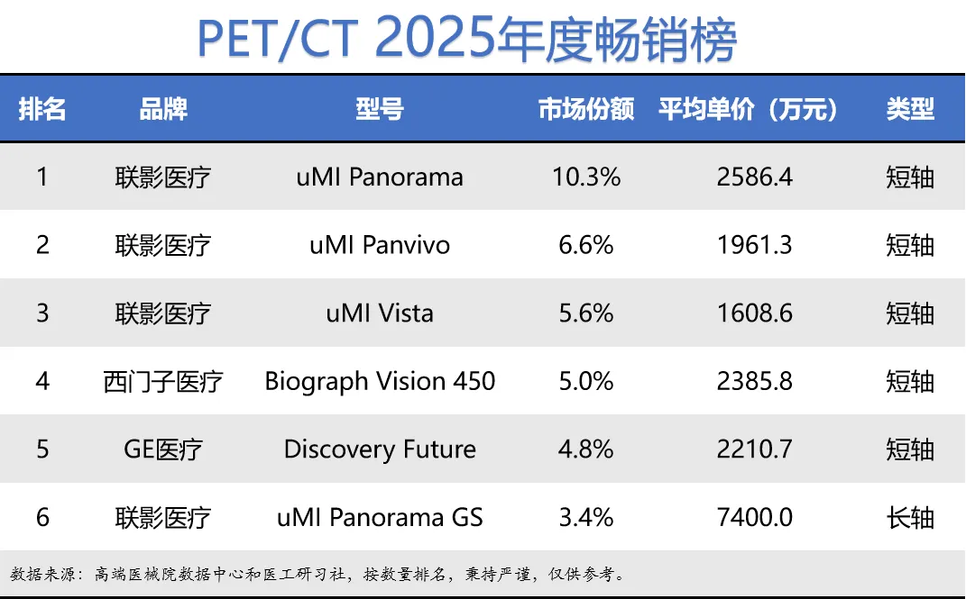 据行业统计,我国PET/CT行业超10个品牌,其中2025年有市场销量7个。其中,短轴PET/CT的平均单价约2191.7万元,长轴PET/CT的平均单价约7587.5万元。具体销量排名如下: