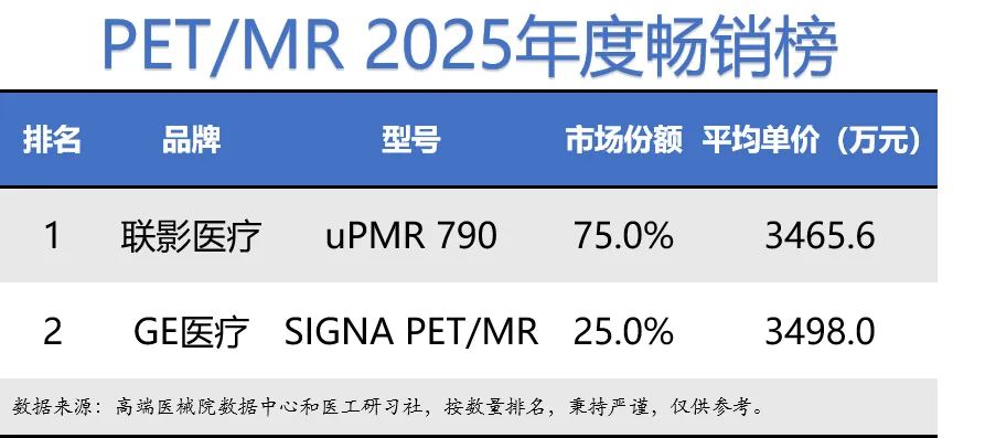 根据行业统计,我国PET/MR行业共3个品牌3个型号,其中2025年有市场销量2个,平均单价约3473.7万元。具体销量排名如下: