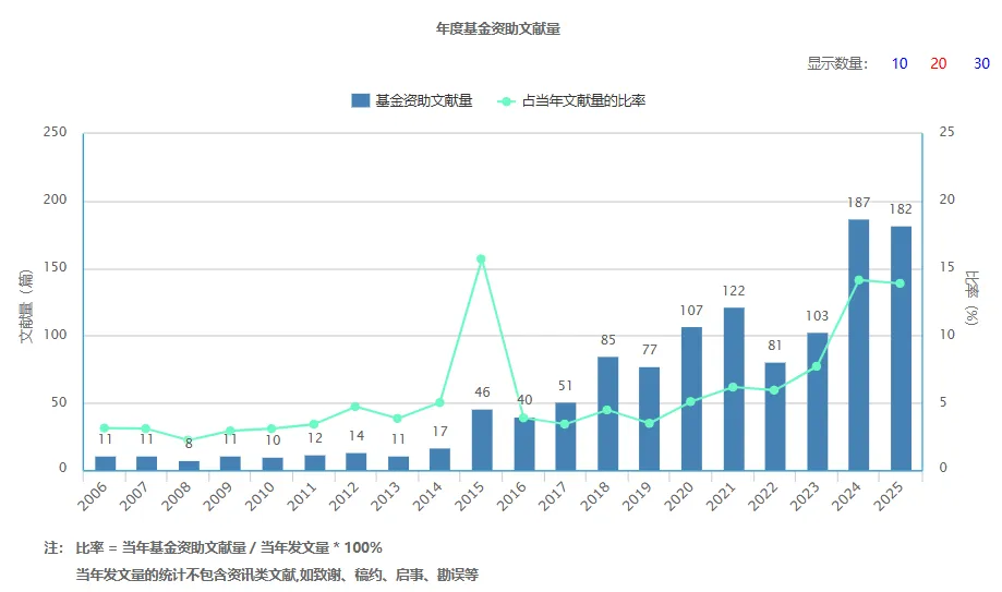 从图3可以看到该刊年度基金资助情况,2024年度基金资助文献量为187篇,占比约14%,2025年度基金资助文献占比约13%,说明该刊对基金资助要求较低,不卡课题,投稿较为友好。