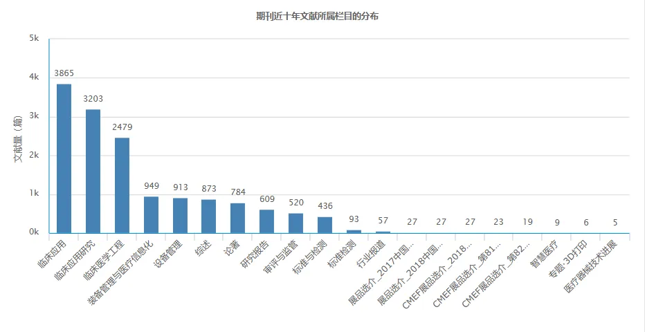 从图4可以看到该刊近十年文献所属栏目分布,空气中临床应用、临床应用研究、临床医学工程等占比较大,该刊的办刊宗旨是“满足临床工程管理、技术人员和医疗设备科研开发工作需要”,传播国内外最新医疗器械科技、市场及政策法规信息。