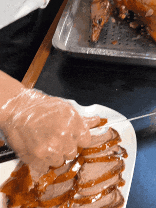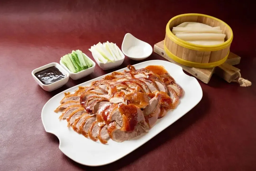 老师傅推着餐鸭车过来时,油亮亮的烤鸭还在滋滋冒油呢,一揭一落便是满屋飘香。