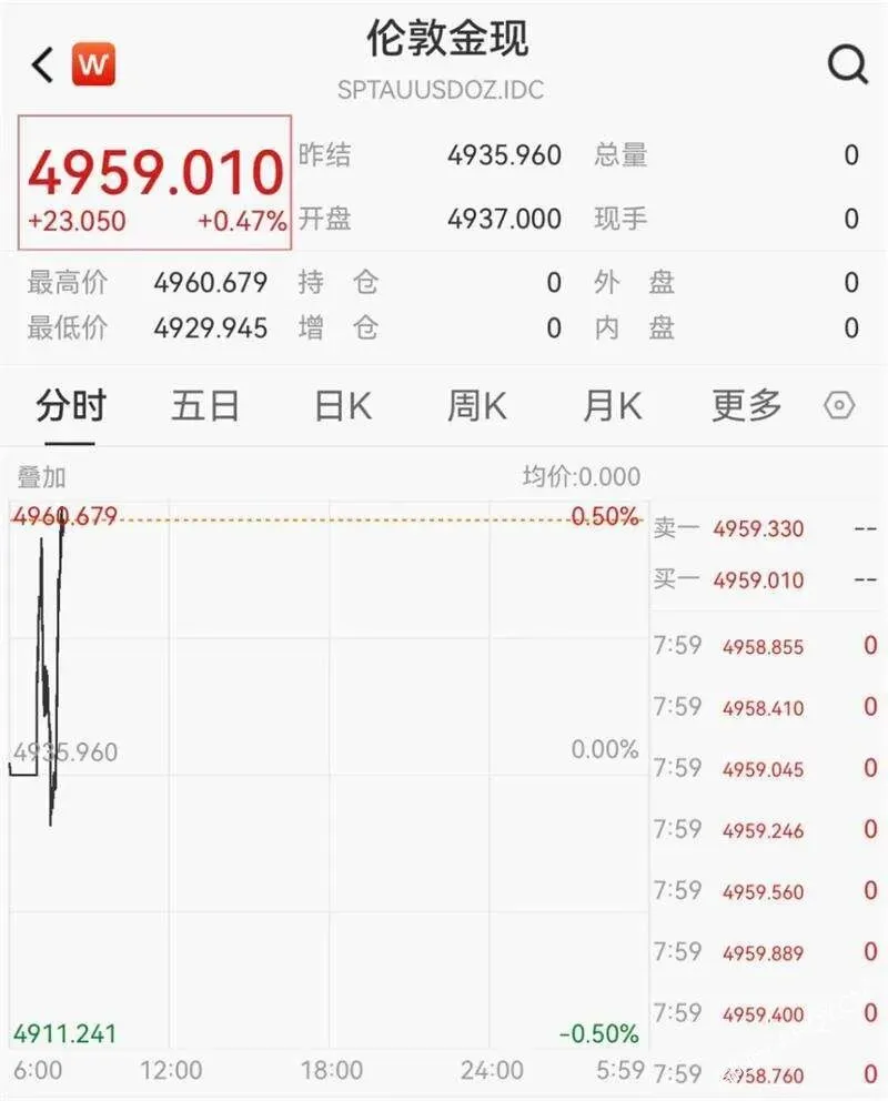 截至记者发稿,现货黄金报4959.01美元/盎司,日涨幅达0.47%。