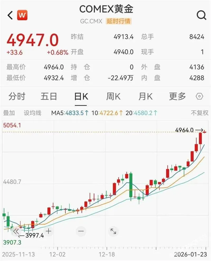 纽约期金也突破4960美元/盎司,截至发稿报4947美元/盎司,日内涨0.68%。