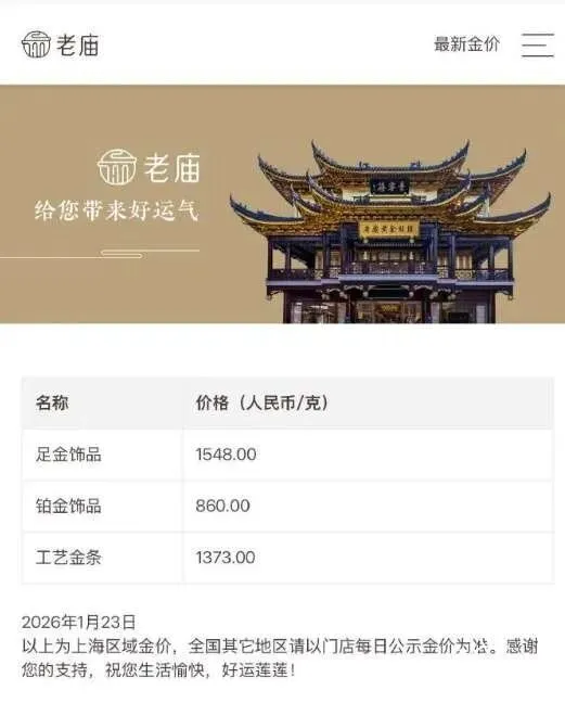 记者查询到,目前周生生足金饰品报1545元/克,较前一日1492元/克涨53元。老庙黄金足金饰品报1548元/克,较前一日1496元/克涨52元。 老凤祥足金饰品报1538元/克,较前一日1495元/克涨43元。
