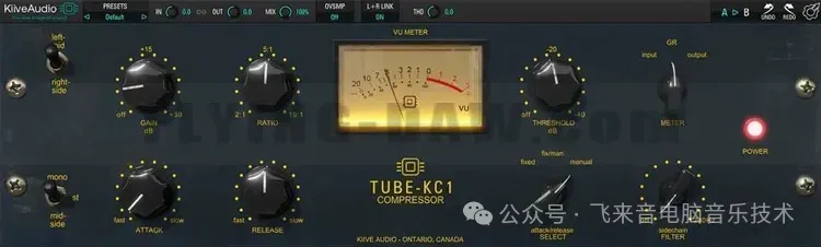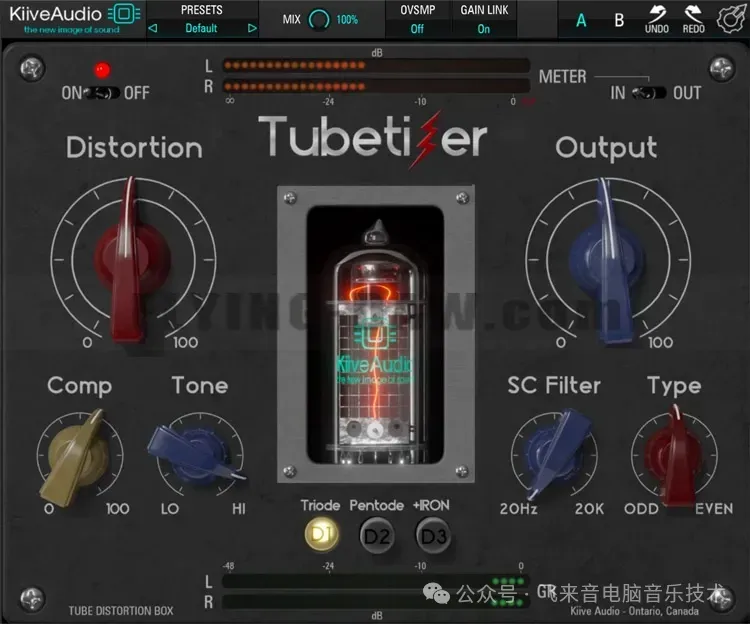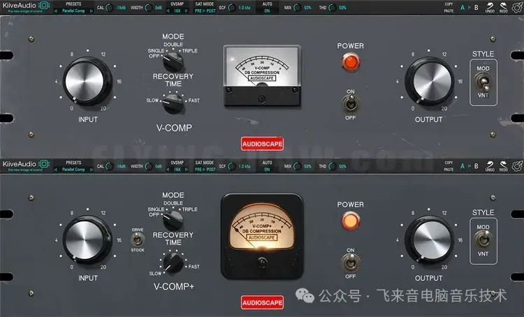 V-Comp 具有光学压缩器标志性的重量感和密度,同时是一款音乐性和染色十分突出的压缩器,原版硬件同时具有 7 条内置电子管和铁质变压器!为了充分发挥出 V-Comp 那迷人的饱和能力,Kiive 在 Single、Double 和 Triple 模式外增加了第四个选项,也即 “Bypass” 模式,非常好理解,完全将电路中的压缩部分旁通掉,让信号只通过全电子管电路和肥厚的变压器染色!V-Comp 具有非常轻柔的拐点,这是 Vari-Mu 压缩器天生的特性,并且对于大部分素材来说,都可以实现十分自然的压缩听感。