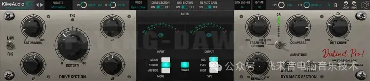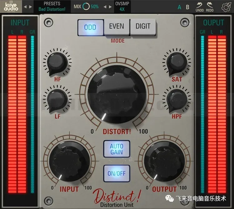 基于在现代模拟处理器中发现的令人难以置信的谐波饱和。Distinct! 将所有这些丰富的谐波特性打包到一个插件中。利用它得到富有轻微饱和感觉的鼓音色,人声和混音总线,或利用这个插件为一些重型音色带来疯狂的粗犷音色,扭曲的人声特效等。这上面有三种模式可以选择:ODD模式产生三次谐波,带来前卫的音色;EVEN模式带来丰富的饱和染色;DIGIT模式显然是数字削波了,可以用于辅助母带响度处理。