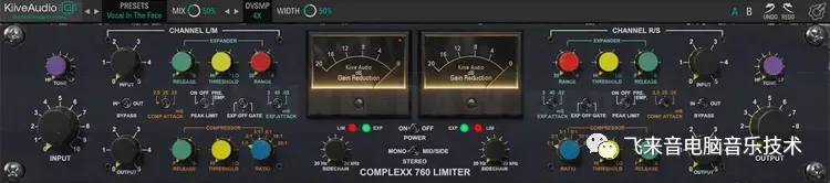 Complexx 来自于 1960 年代时英国一款非常经典的压缩器 F760X-N,后来由 Q2 Audio 改进为 F760X-RS,这便是 Complexx 760 所模拟的硬件原型。作为一款场效应晶体管压缩器,它有着出色的启动响应(最小 0.02ms),这就导致了,对于瞬态响应较快的声音,是有着很强的控制力的。尤其是打开 Limit 限制模式后,你会明显感觉到一种在硬件上十分熟悉的控制力和稳定感,这是笔者目前在任何模拟压缩器插件上都没有见过的效果,简直绝了!
