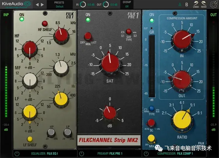 这不是当前流行的500系列,而是基于70年代经典的Danner Cassette Modules模块化通道条,它由3个部分组成、PRE70话放染色部分、EQ7D参量均衡器部分、COMP2R光电压缩器部分组成,可以用于平行压缩。全模组带有超采样功能,并且可以调节模块工作顺序。现在,Filkchannel Strip 通道条更新到了 2 代,Filkchannel Strip MK2 将是一个拥有 7 款风格音色可变式的七十年代经典模块化通道条!