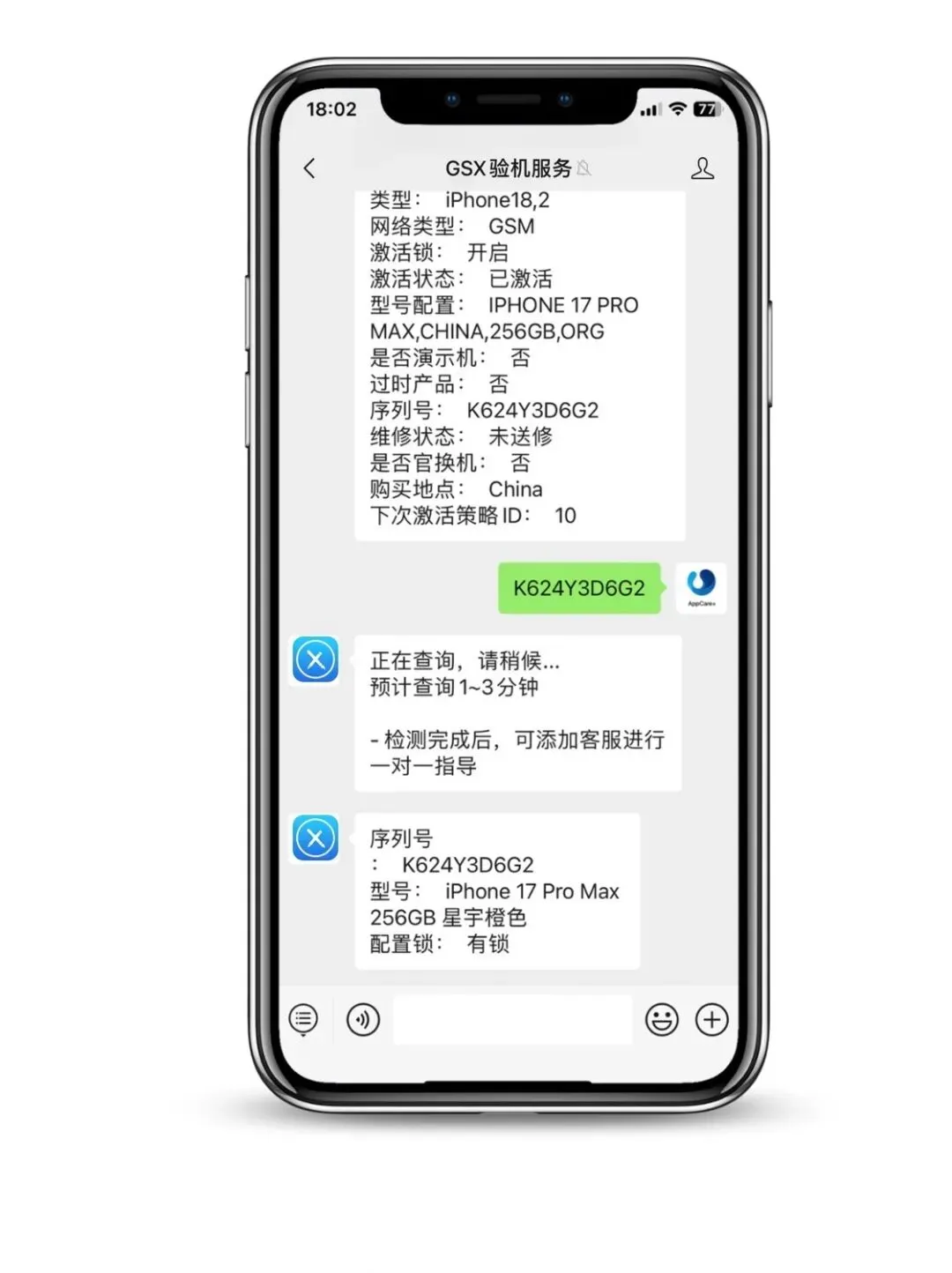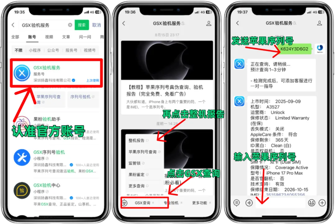 第一步:关注公众号【GSX验机服务】,点击左下角菜单中的【GSX查询】;