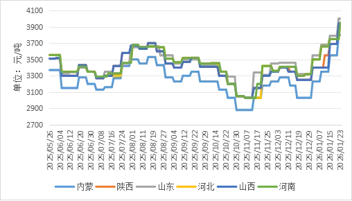 本周高温煤焦油市场呈现“整体上涨、区域分化”的特征。西北地区内蒙价格从3550元/吨涨至3800元/吨,涨幅250元/吨;华东地区山东、江苏价格均从3790元/吨涨至4000元/吨,涨幅210元/吨。全国高温煤焦油市场重心继续上移,主流地区价格均保持在较高水平。本轮价格上涨始于2025年12月,市场在经历短暂下行后迅速回弹。