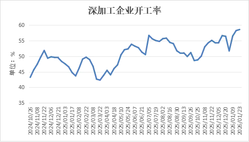 与供应端形成鲜明对比的是,需求端表现强劲,成为价格上行的另一核心支撑。本周深加工行业装置利用率达58.58%,环比提升0.33%。场内辽宁东颢15万吨装置检修结束恢复生产,玉门市尚能科技30万吨装置试运行,周内暂无装置停工计划。下期来看周内新疆和润以及宝舜科技存有复产计划,预计开工仍存上涨趋势。