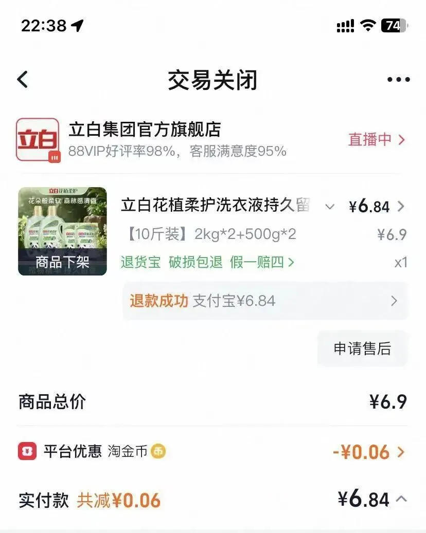 在社交平台上,还有消费者反映,错标价格的产品还有立白花植柔护洗衣液(除菌4斤装),标价8.8元,该订单也被官方退款。