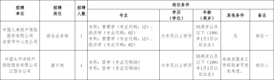 中国人寿财产保险股份有限公司吉安市中心支公司、中国太平洋财产保险股份有限公司江西分公司为吉安市大病保险业务中标单位,现因工作需要,面向社会公开招聘联合办公人员,派驻到吉安市医疗保障局工作,现将有关事项公告如下: