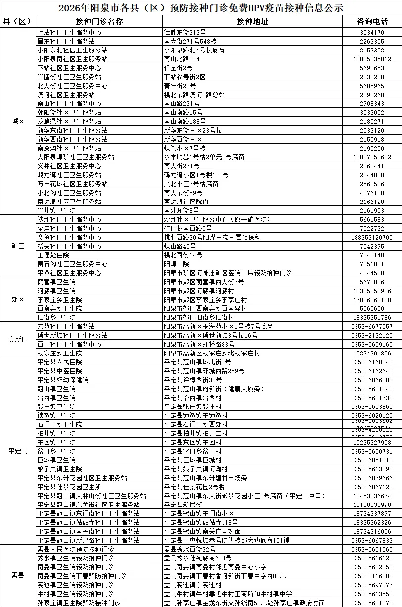 现阶段,全市配有免费双价HPV疫苗接种门诊信息如下: