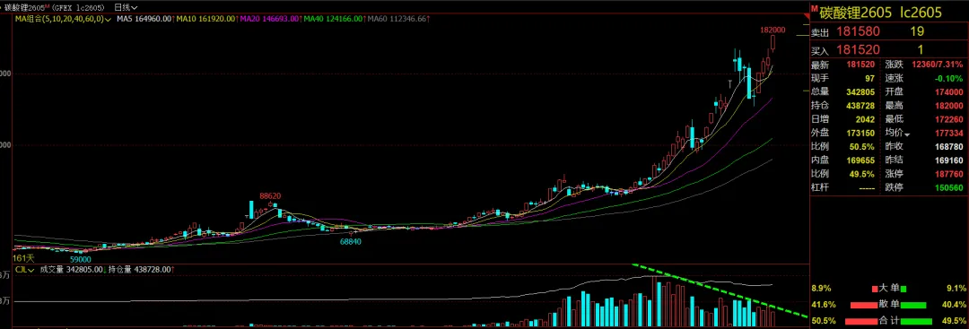 昨天碳酸锂期货主力2605合约高开高走,17.5万压力位突破的毫不费力,盘中最高涨至182000,报收181520,增仓2042张。我在上一篇评论中