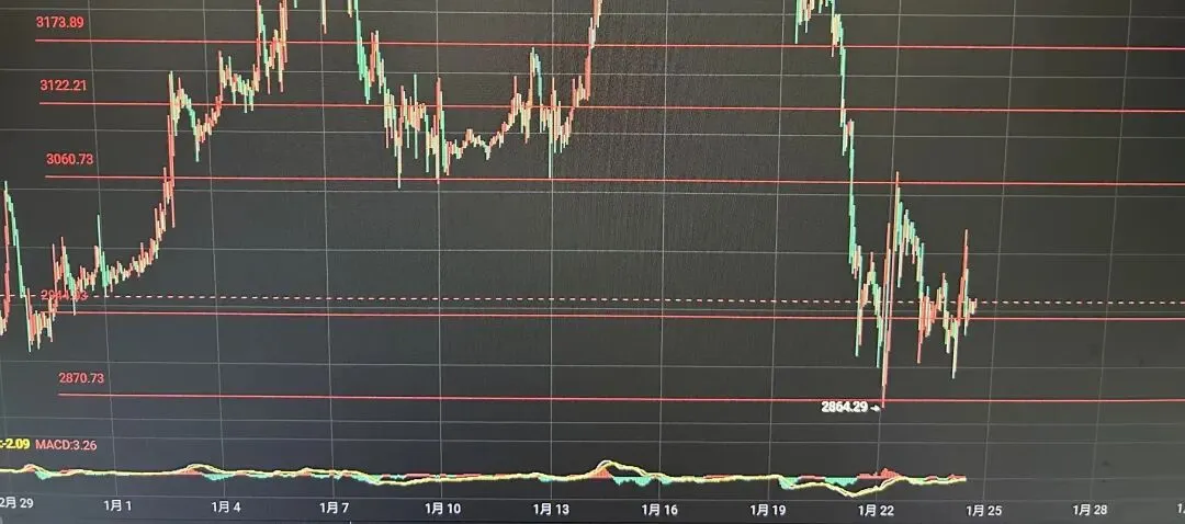 以太坊走势与比特币联动但表现更为弱势。当前价格在2,950美元附近徘徊,3000美元心理关口得而复失,表明多头反攻力量不足。