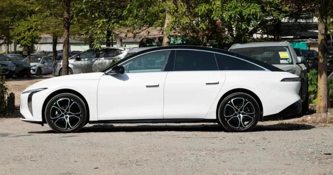 侧面就能看出轿跑的味道了,溜背加悬浮式车顶,双色车身配上无框车门,这情绪价值确实给得足,18英寸轮毂尺寸刚好,隐藏式门把手也是标配。ABC柱做了一体式无边界设计,镀铬装饰条一勾勒,整个车身姿态就出来了,趴得比较低,运动感是有的。尾部呼应前脸的圆润造型,但收得比较短,有点小跑车那意思,贯穿式尾灯内置208颗LED灯珠,解锁的时候有流水动态效果,年轻人应该会喜欢这些细节。