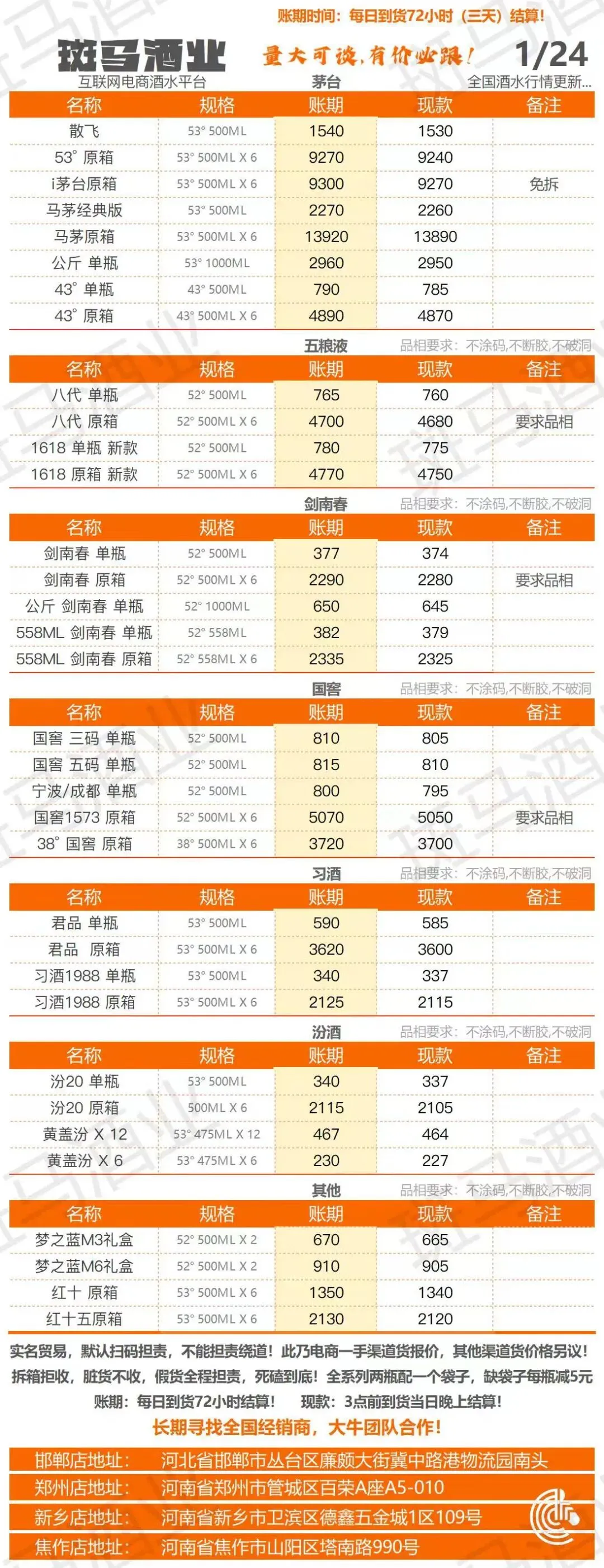 >斑马酒业 26 .1 .24 采购行情报价