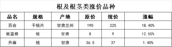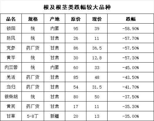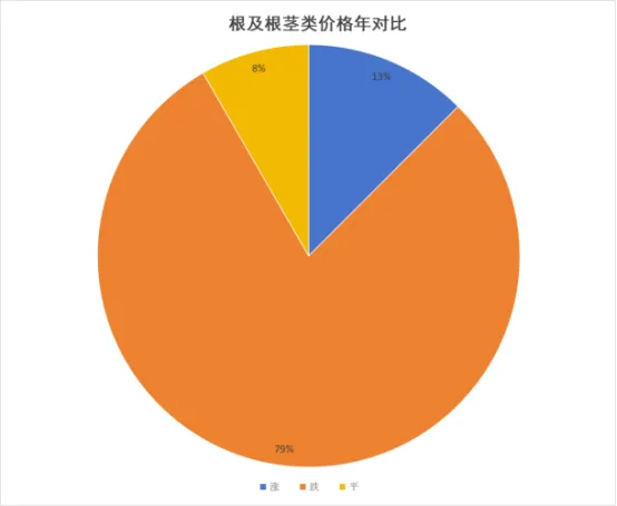 根及根茎类价格上涨的品规占13%;跌价品规占79%;价格持平的品规占8%。