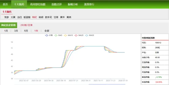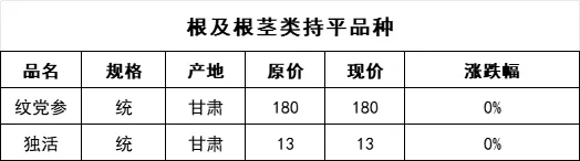 1、纹党参:全年涨跌幅为0.0%,价格维持在180元/kg的高位,目前无任何涨跌波动,是2025年价格最稳定的中药材品种之一。