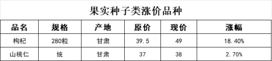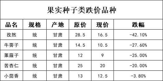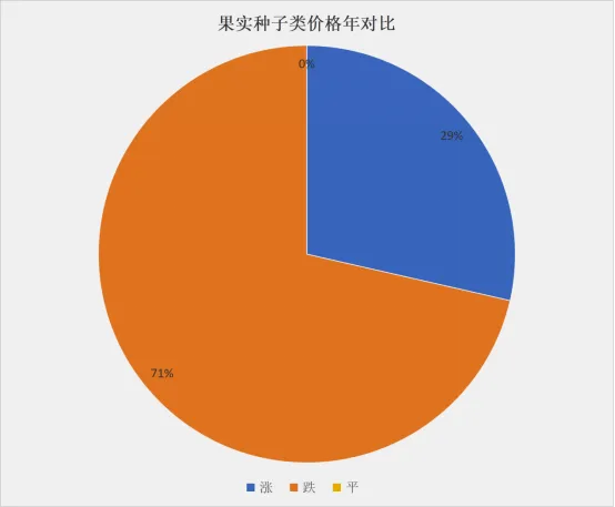 果实种子类价格上涨的品规占29%;跌价品规占71%;无价格持平的品规。