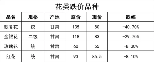 花类无涨价品规;跌价品规占100%;无价格持平的品规。