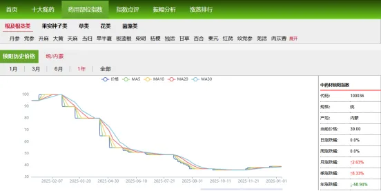 5、肉苁蓉:肉苁蓉作为滋补类药材,其需求受经济环境和消费意愿影响较大。在非必要消费收缩的背景下,其需求弹性显现,高端需求疲软,行情一路下滑。2025年初至约6月,价格一路走低,毫无抵抗。2025年7月至10月,跌势趋缓,但方向依然向下。市场可能开始有“抄底”声音,但每一次微弱反弹都成为新的做空机会。2025年11月至12月,价格从38元/kg跌至33元/kg左右,部分持货商不计成本抛售,而买方持续观望。