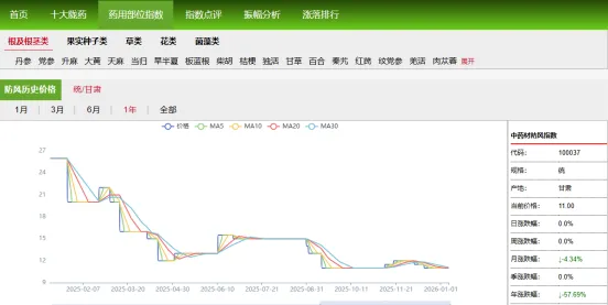 6、羌活:羌活价格在2025年经历“缓跌→急跌→企稳”的过程,价格从85元跌到48元,全年跌43%。年初价格稳,2月后慢慢跌,7 - 8月跌得猛,8月后在48元稳住。现在价格处于低位,后续需看需求或产量变化决定是否反弹。