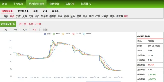 3、党参:2025年甘肃岷县当归城市场,党参药厂货的价格在这一年里经历了几个明显的阶段:年初平稳运行,年中冲高至约120元/kg的高点后持续回落,年末加速下跌至36.5元/kg,全年跌幅超57%。这一年党参价格经历了“过山车”行情,当前虽有微弱反弹,但整体下行趋势未改。
