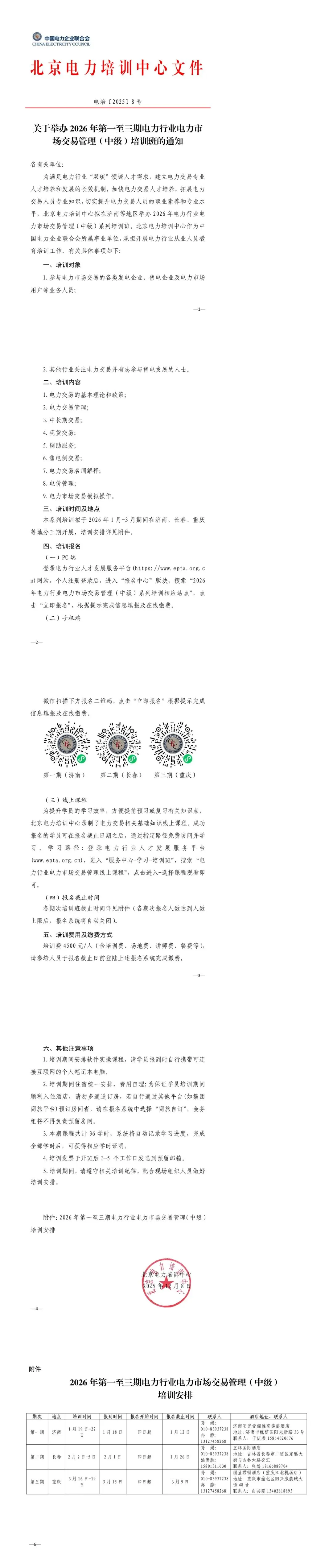 >关于举办2026年第一至三期电力行业电力市场交易管理(中级工)培训班的通知