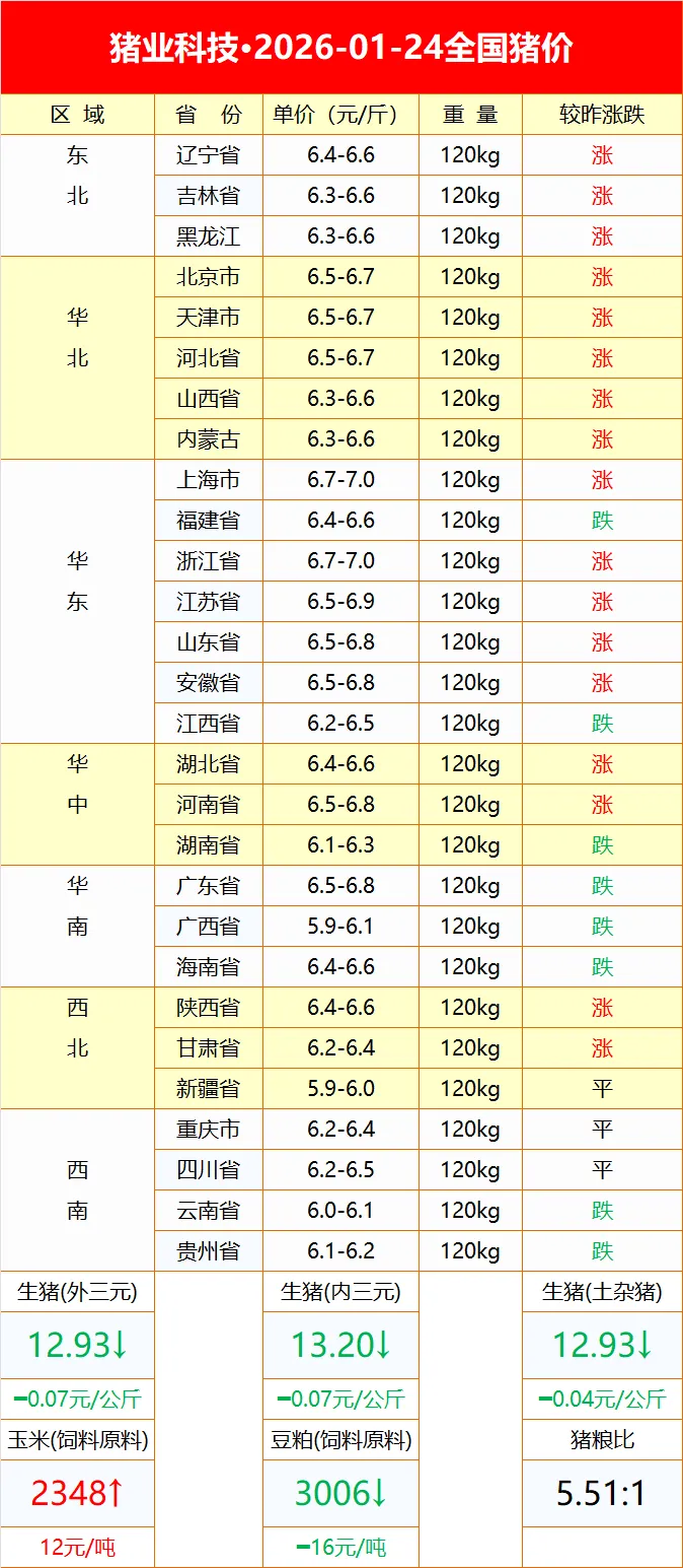 鸡蛋:1月23日蛋价普涨,局部产区价格已突破4元/斤。产区挺价拉涨带动销区跟涨,贸易商被动补货,各产区库存压力减轻。临近周末及腊八节,家庭消费预计小幅提振,叠加市场看涨情绪,蛋价仍有支撑;但随着月底食品加工企业备货收尾及学校陆续放假,需求边际走弱,高价也将抑制采购意愿,短期蛋价涨幅有限,低价区或小幅补涨,高价区逐步趋稳。